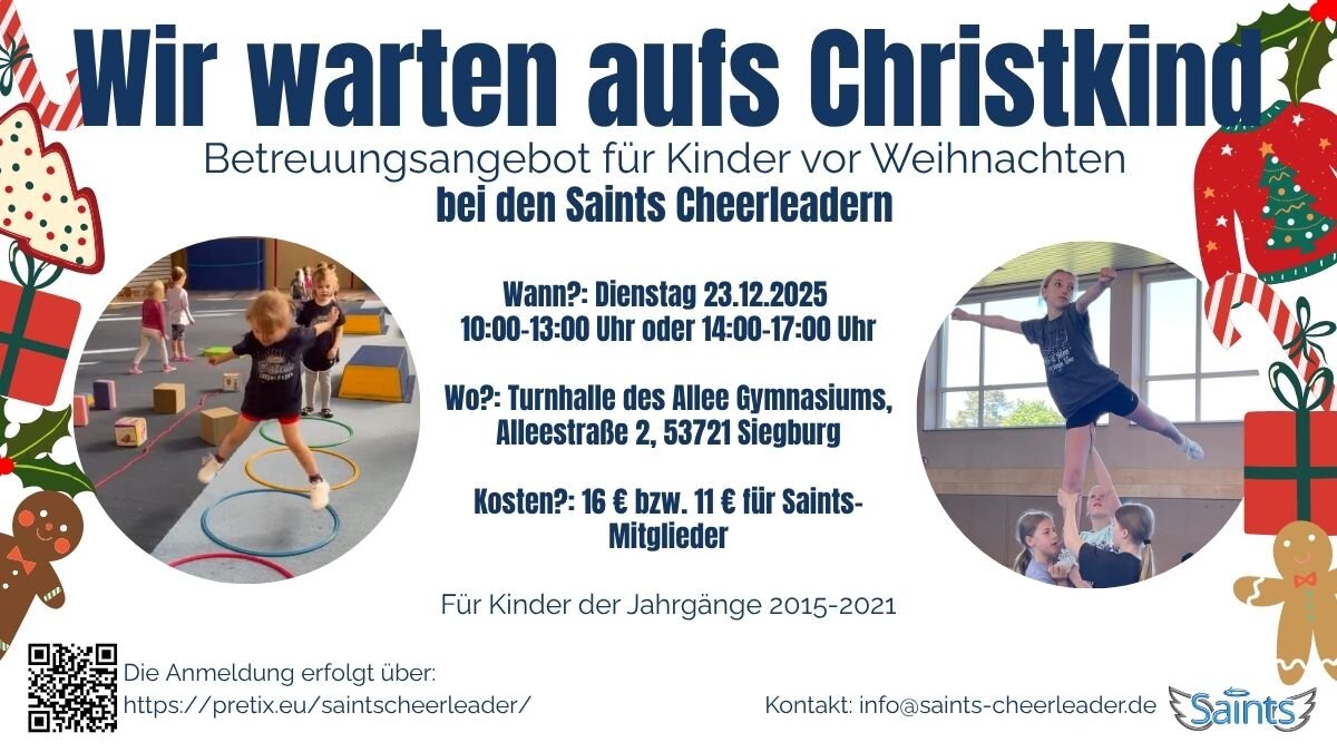 Während die Eltern am 23. Dezember in Ruhe die letzten Weihnachtsvorbereitungen treffen, können sich die Kinder bei den Saints Cheerleadern in der Turnhalle des Alleegymnasiums so richtig austoben!